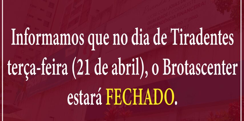 17 abr 2026 Sticky Post By Marketing Posted in Notícias, Novidades Permalink abril 17, 2026 Marketing Horário de funcionamento do Brotascenter no feriado de Tiradentes Sticky Post By Marketing On abril 17, 2026 Para sua melhor programação, informamos o horário de funcionamento do Brotascenter no feriado de Tiradentes. Horário de funcionamento do Brotascenter no feriado de Tiradentes abril 17th, 2026Marketing